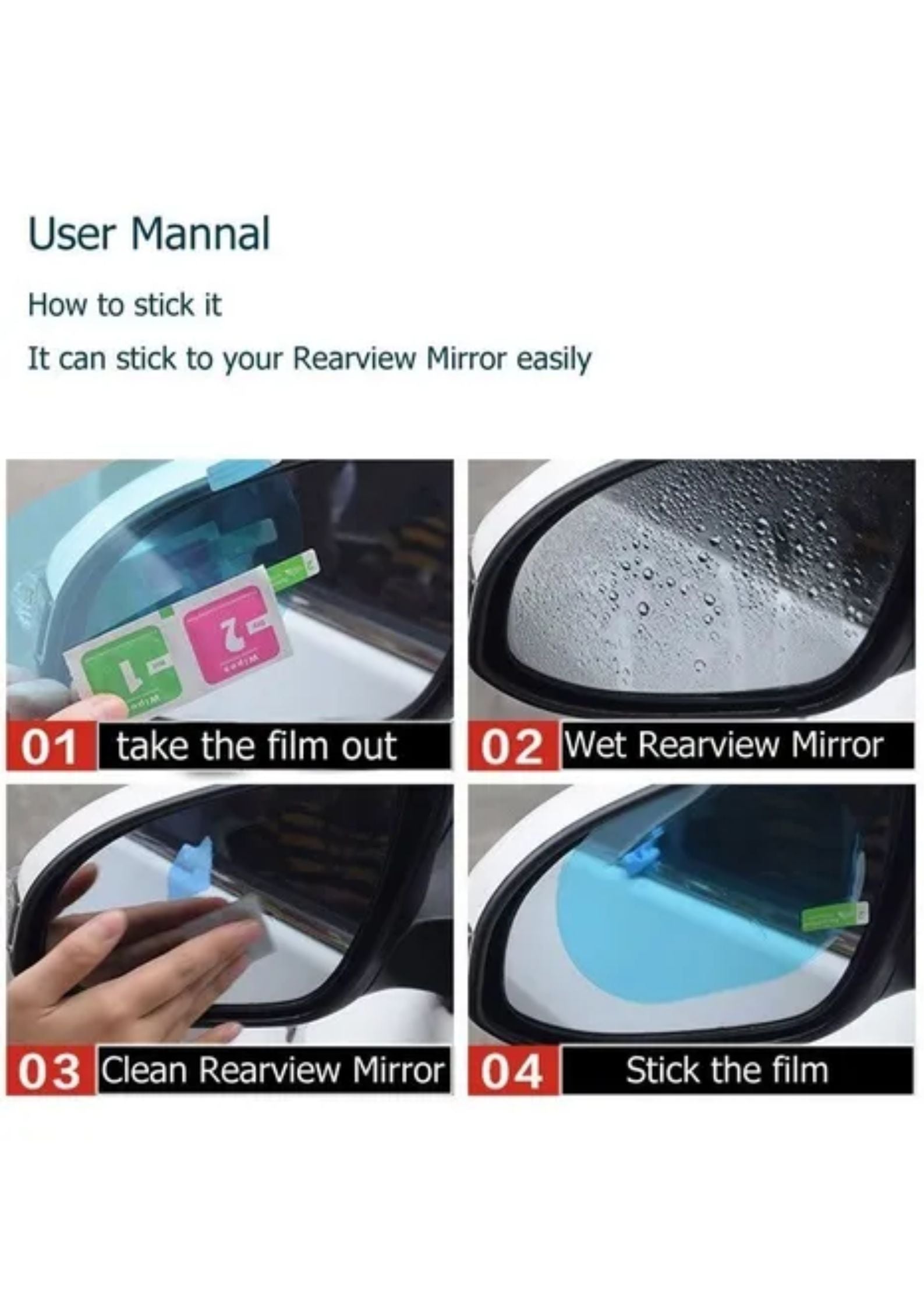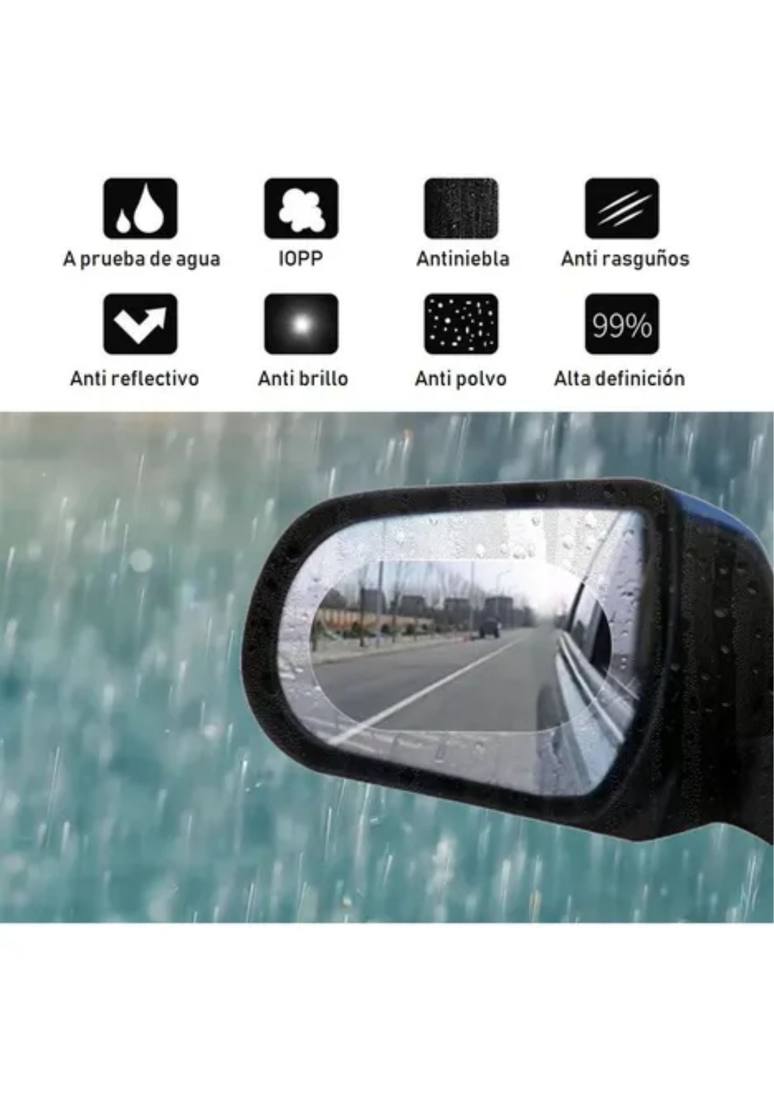 Este adhesivo antiempañante y antilluvia se instala fácilmente sobre los espejos laterales del carro, ayudando a mantener una visión clara y segura en todo momento.